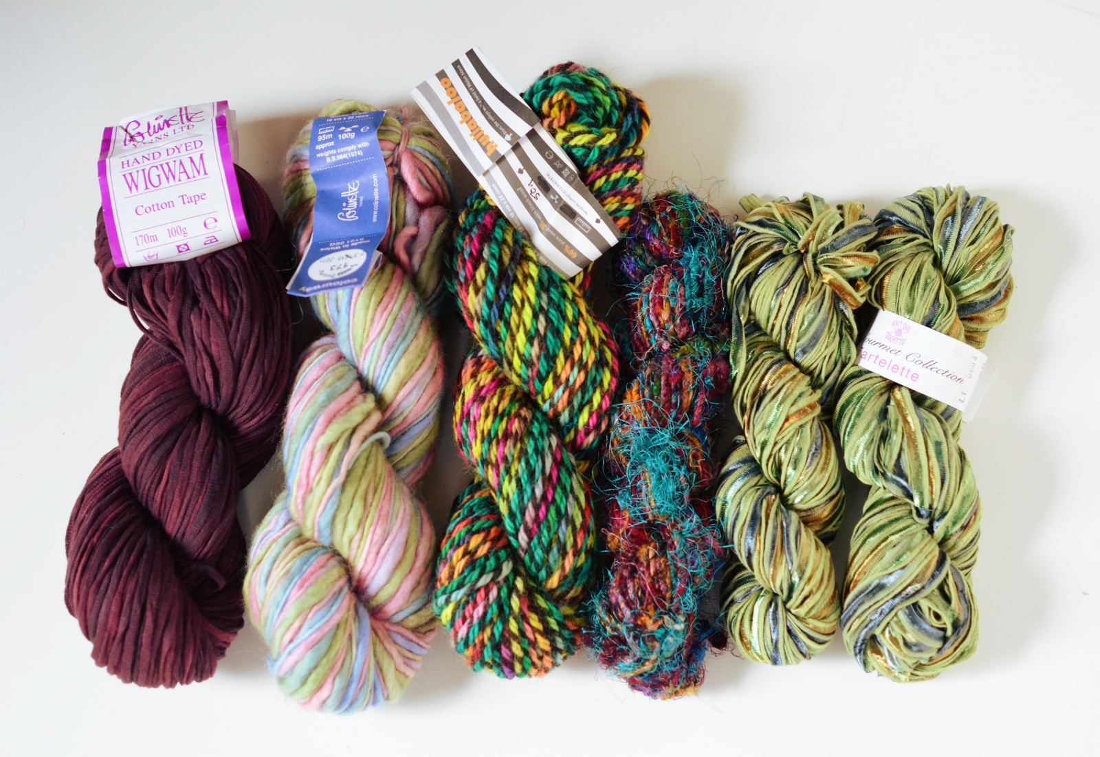 Multi Mix– Colinette, sari silk, Knit One Purl Too, Cotton tape– 450g of various funky, colorful, beautiful yarns.