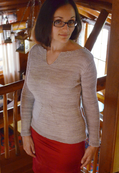 Visible hourglass shaping, a uniquely feminine neckline, and folded hems make this pullover a special, shapely treat.